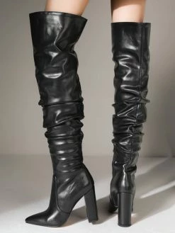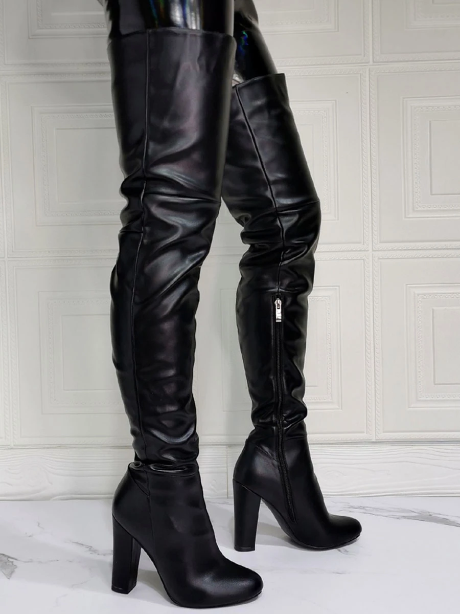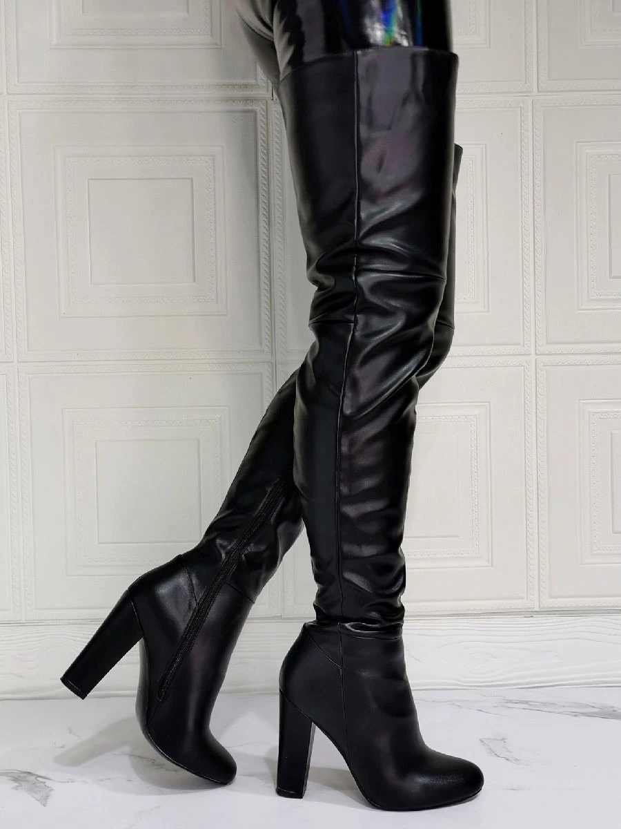 Women Thigh High Boots PU Leather Black Sky High Chunky Heel Over The Knee Boots