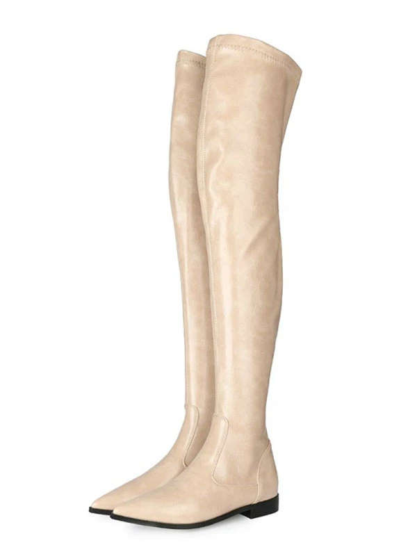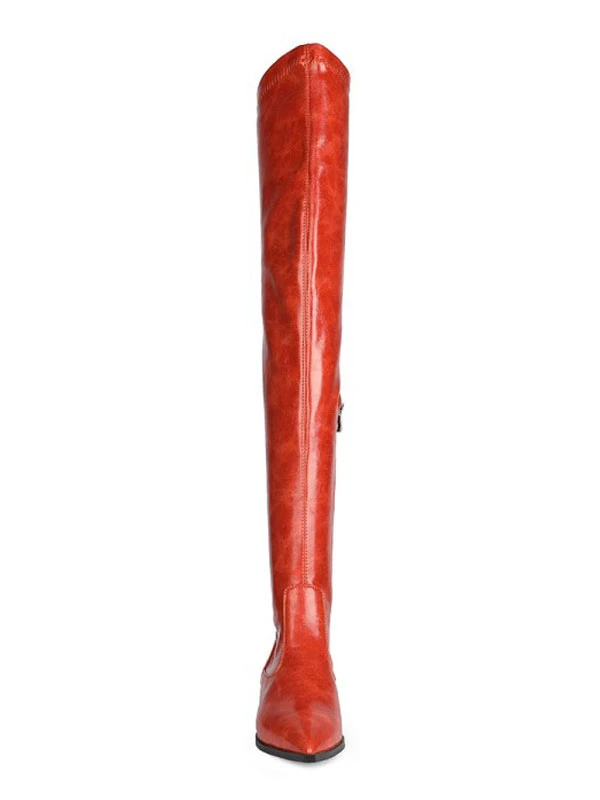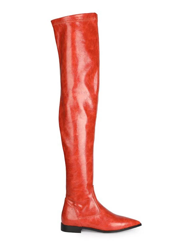 Womens Thigh High Boots Orange Red PU Leather Pointed Toe Flat Heel Boots