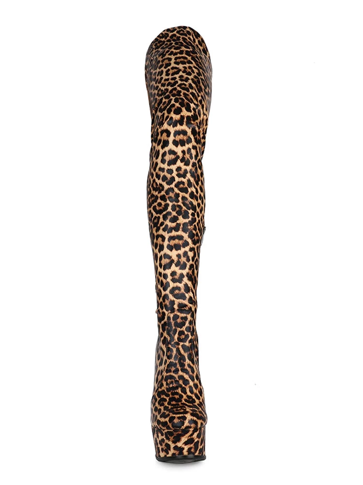Womens Thigh High Boots Round Toe Leopard Print Stiletto Heel Winter Platform Boots For Women