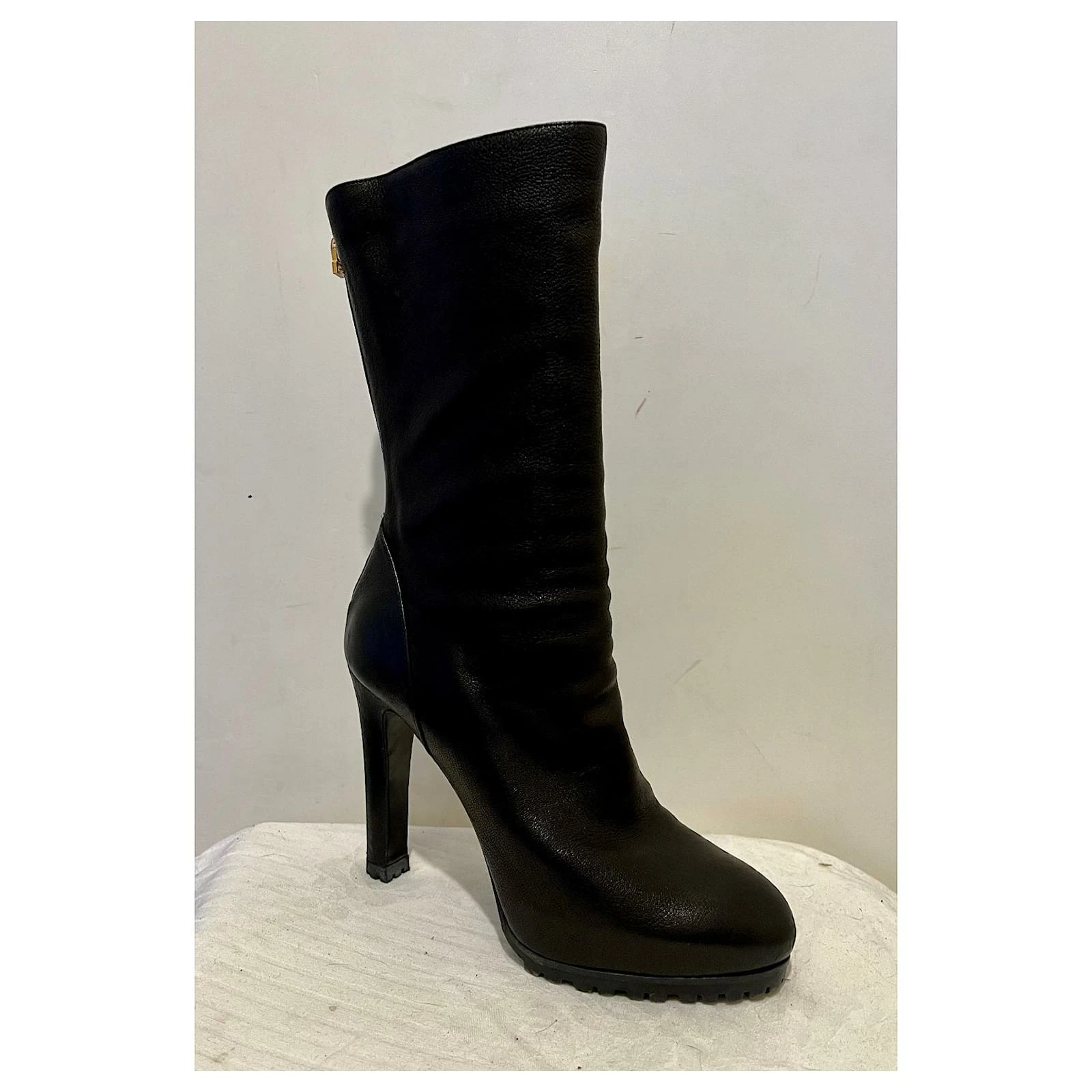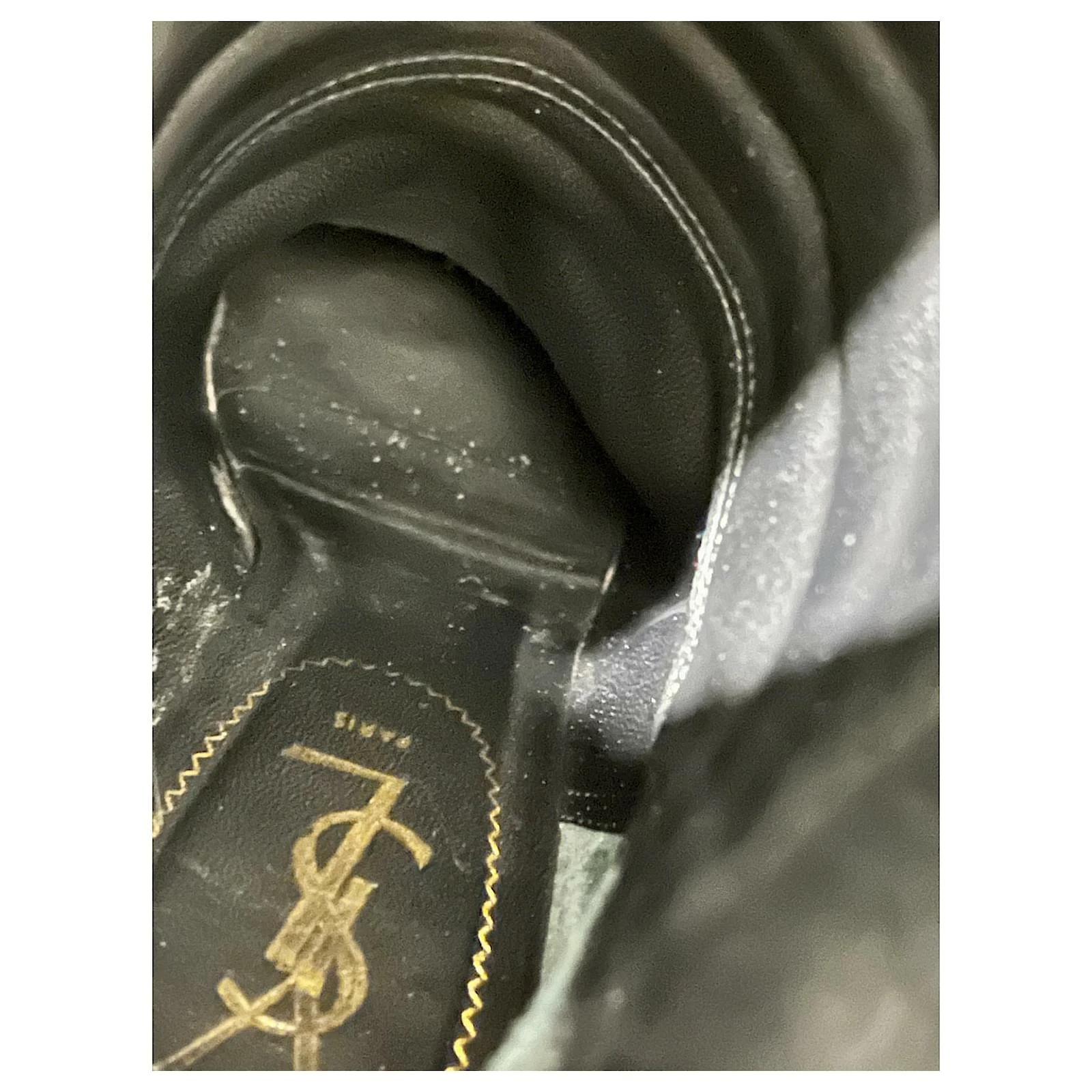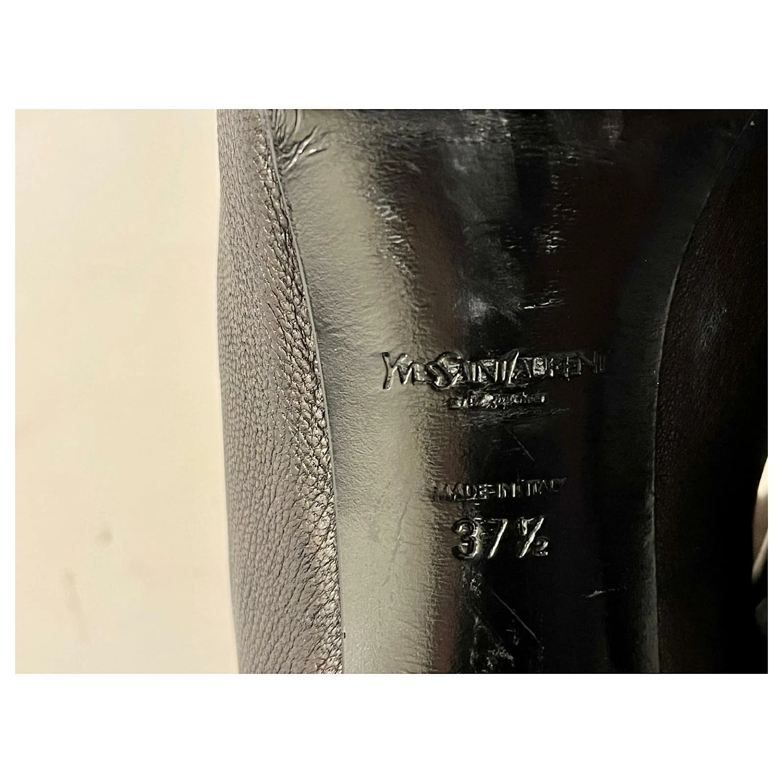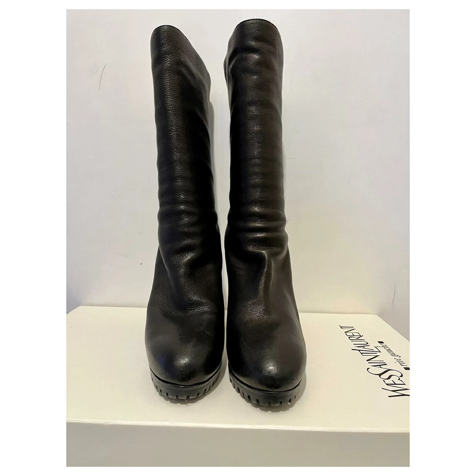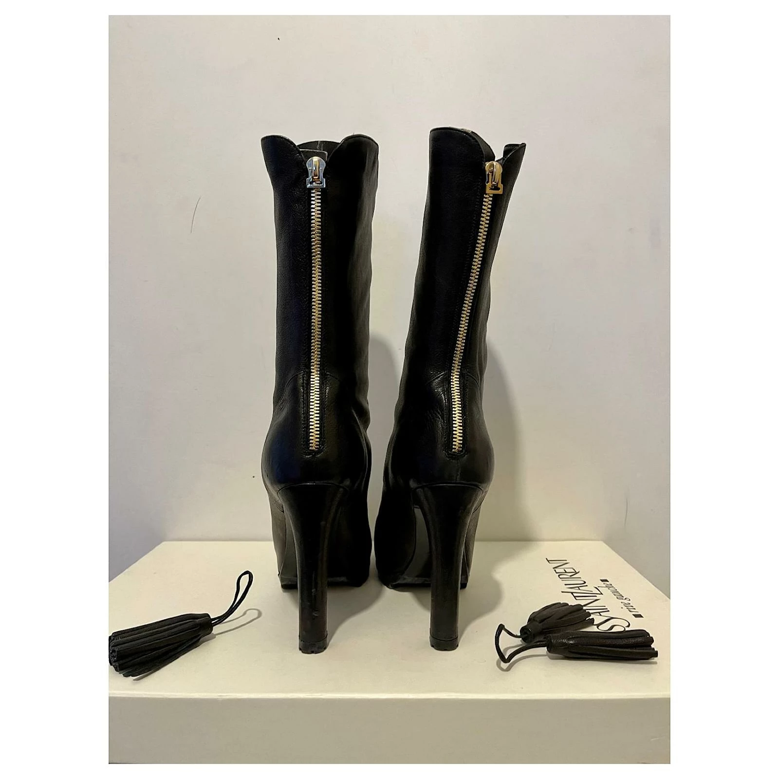 YSL Passy 90 Ranch boots with leather tassles that can be attached (I never attached that and put them into the box in a clear plastic envelope, the zipper is in the back, they come very generously and fit more like a size UK 6, they have a hidden platform, a structured sole for better grip, the leather is super soft and they are lined in leather. They have very minimal scuffing, a little bit on the heel and shoes but not visible when worn and that can easily be covered with shoe polish, but even without it is not noticeable when they are worn.